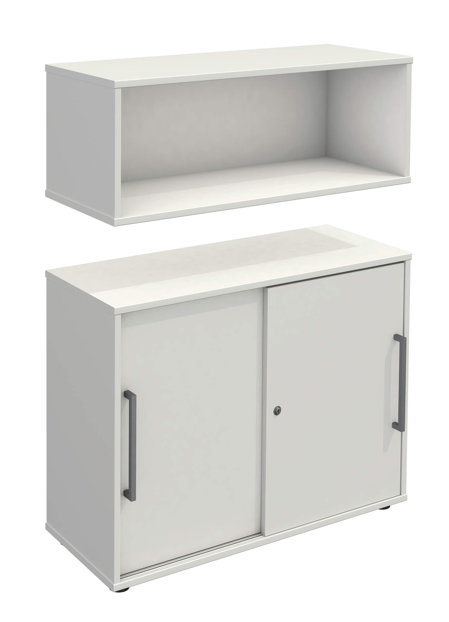Der Aufsatz (1 Ordnerhöhe) macht aus dem Schiebeschrank mit 2 Ordnerhöhen ein attraktives Highboard. Mit der Sichtrückwand kann der Aufsatz auch frei im Raum aufgestellt werden. So können Sie diese Variante als Raumtrenner an Schreibtischen einsetzen.