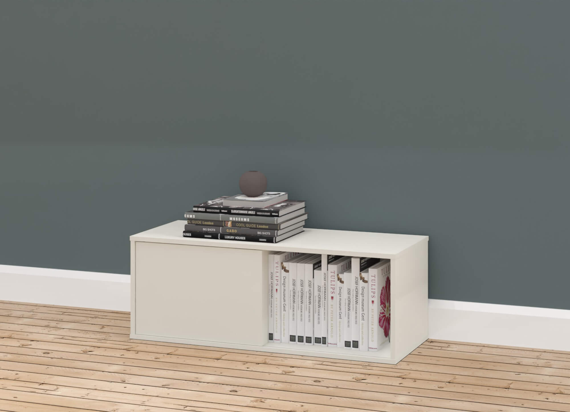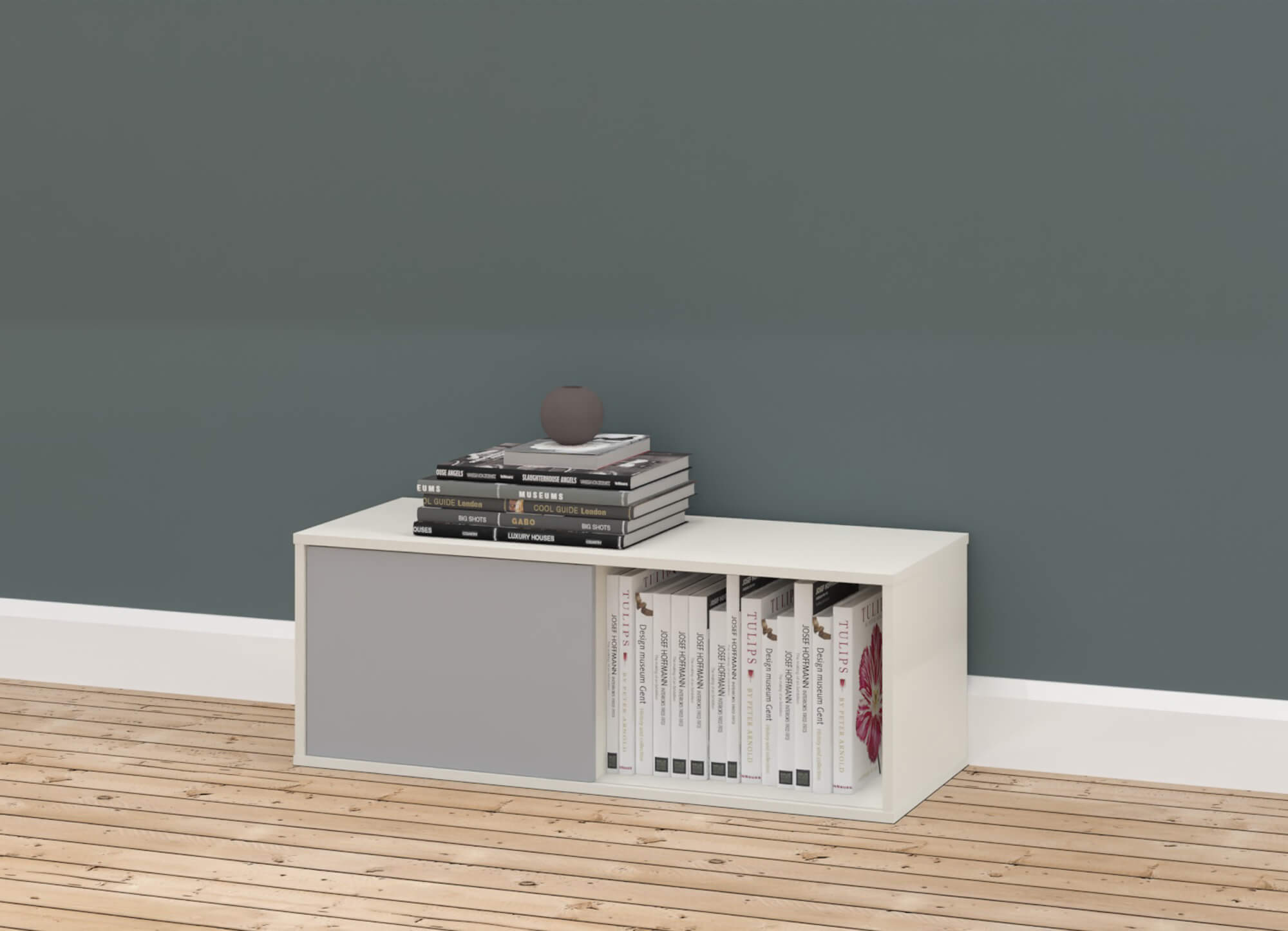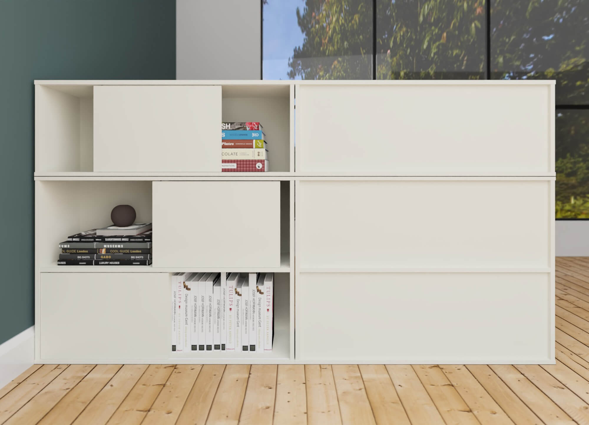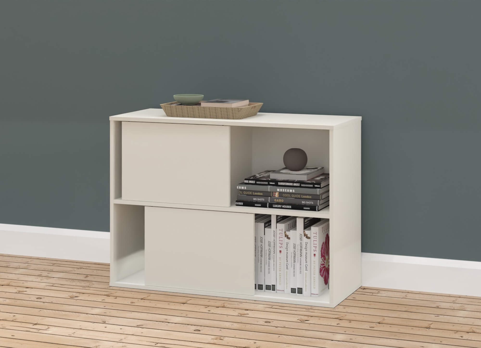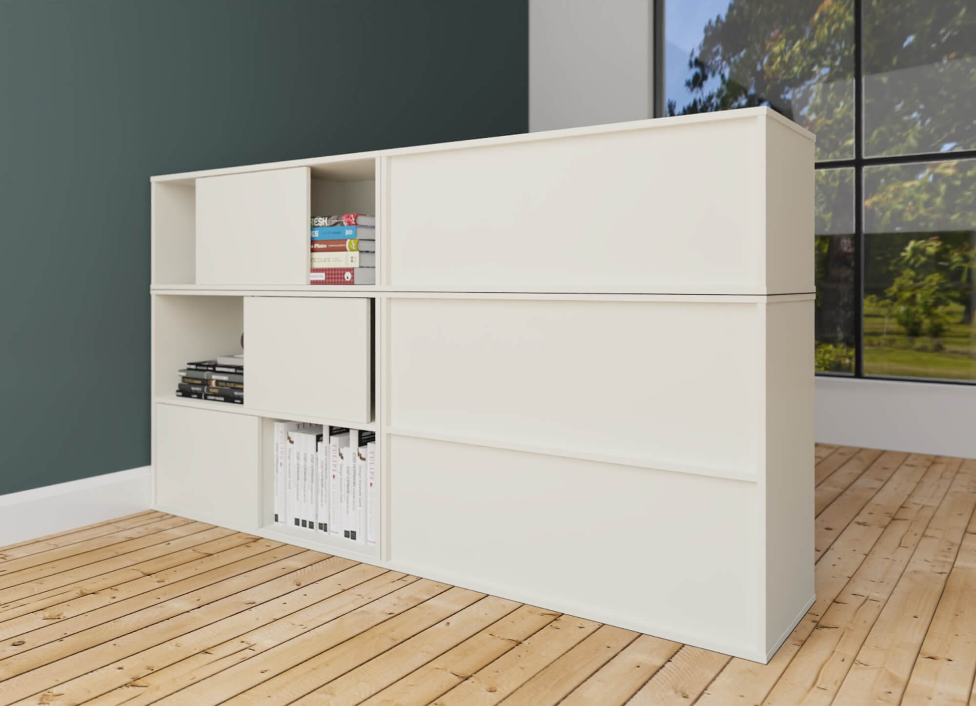 Die Schiebetür-Regale sind vielfältig einsetzbar. So können diese stehend, an der Wand (nur 1OH) oder gestapelt werden. So können Sie attraktive Raumteiler in Ihre Bürolandschaft kreieren.