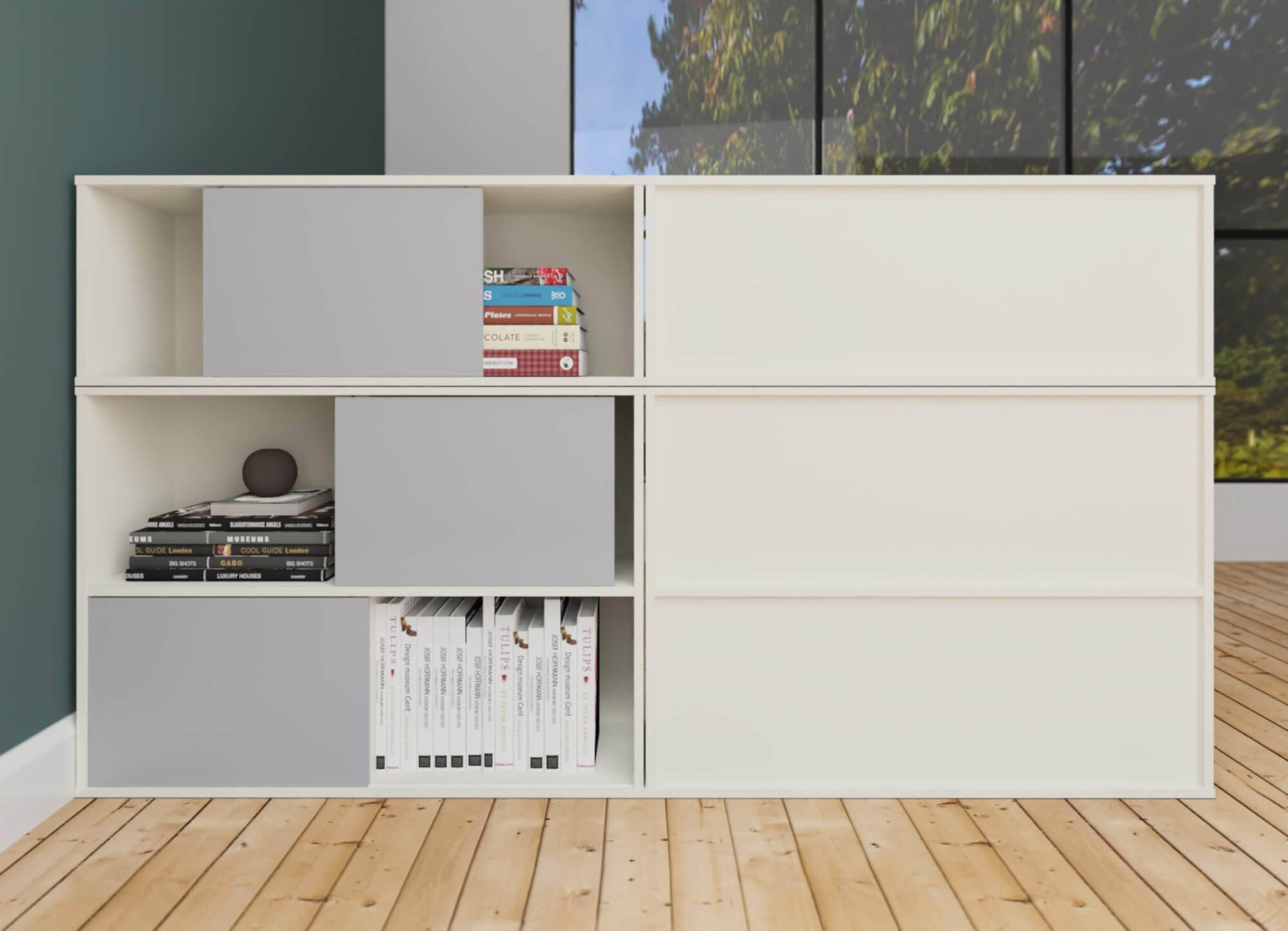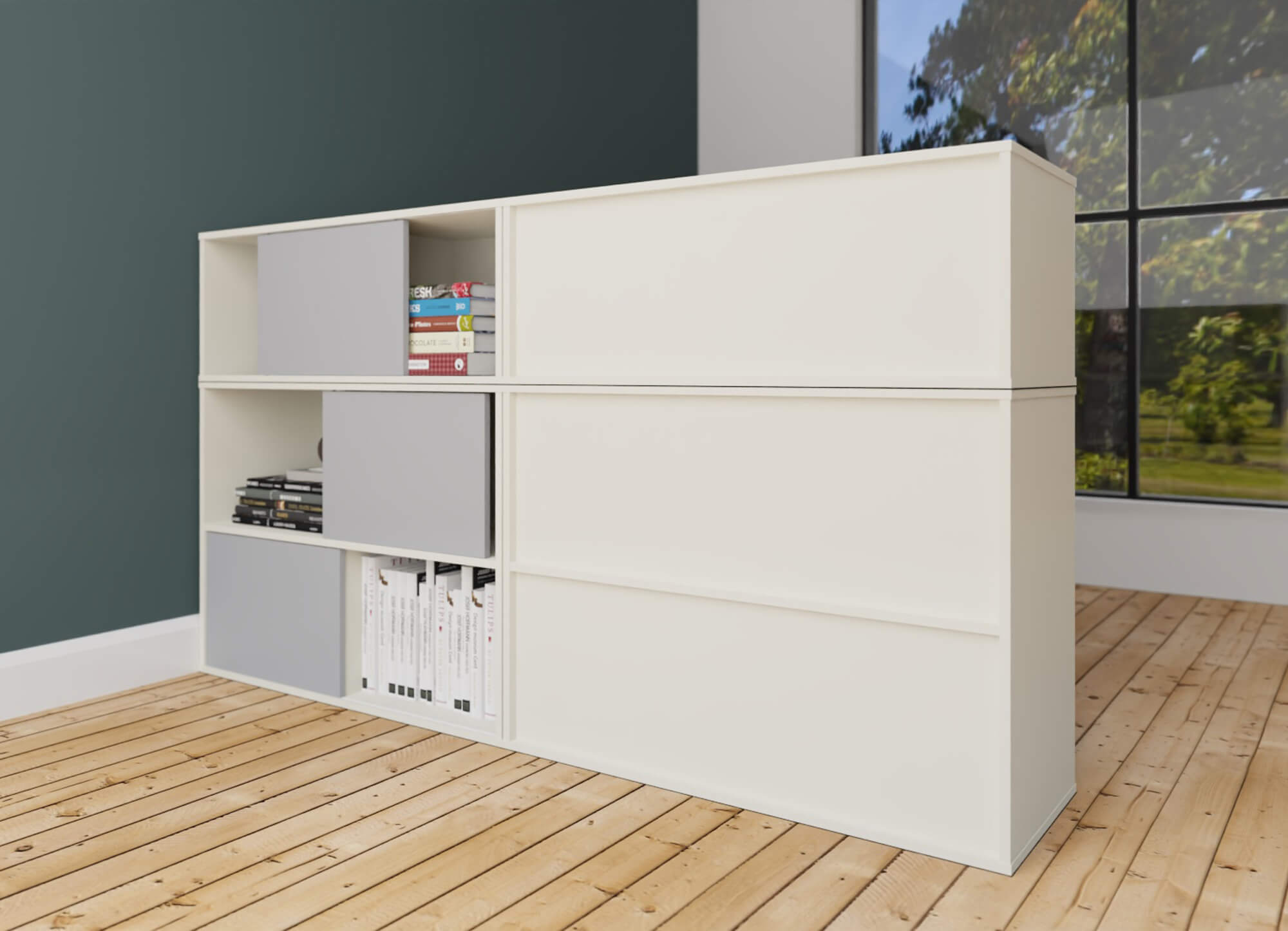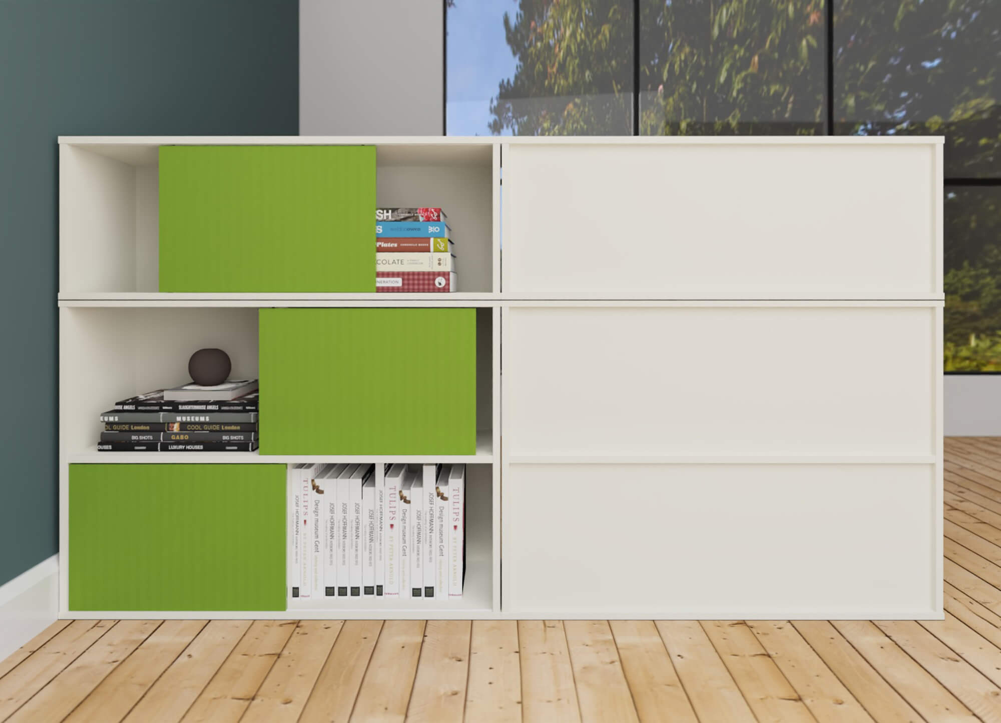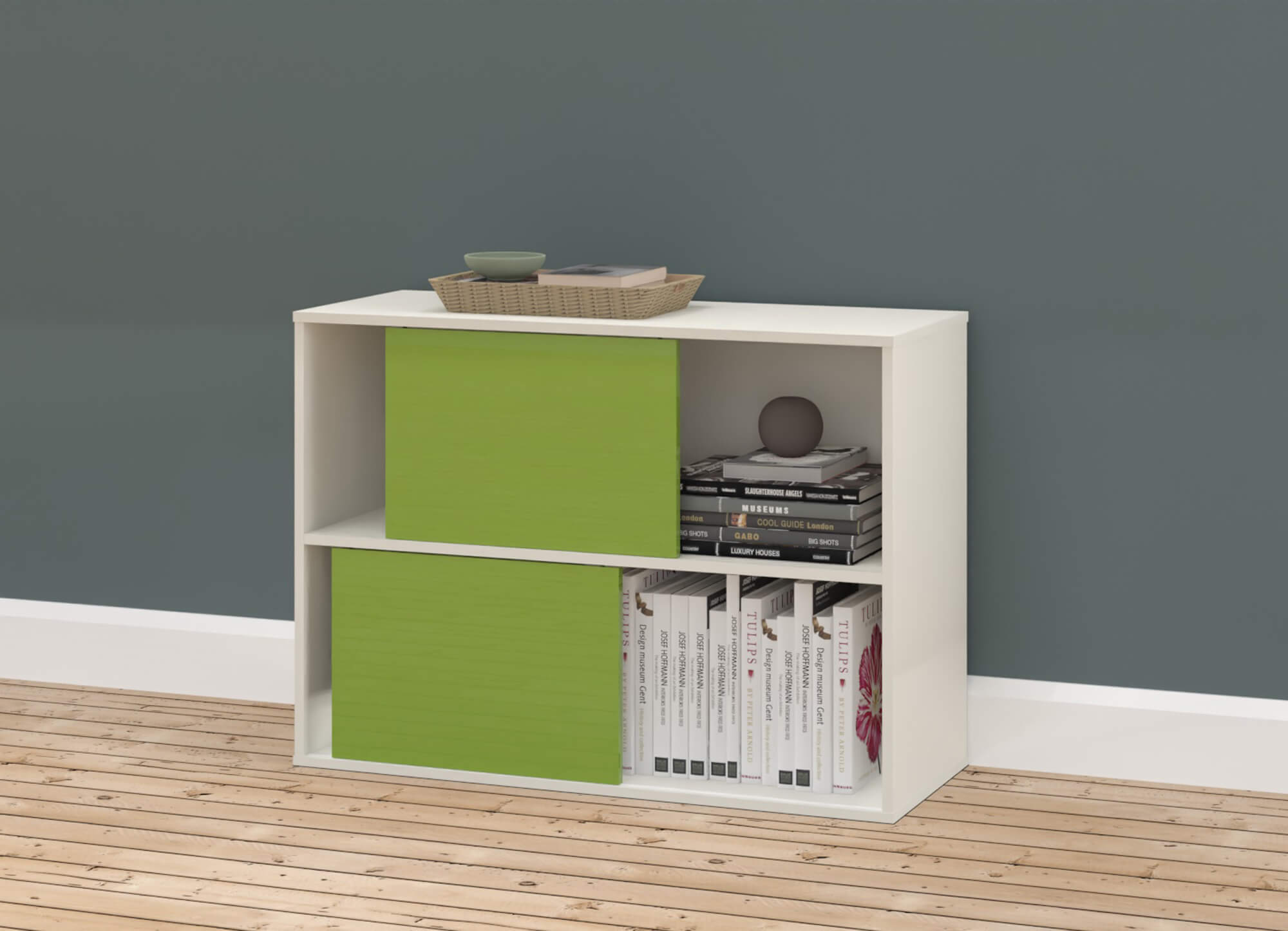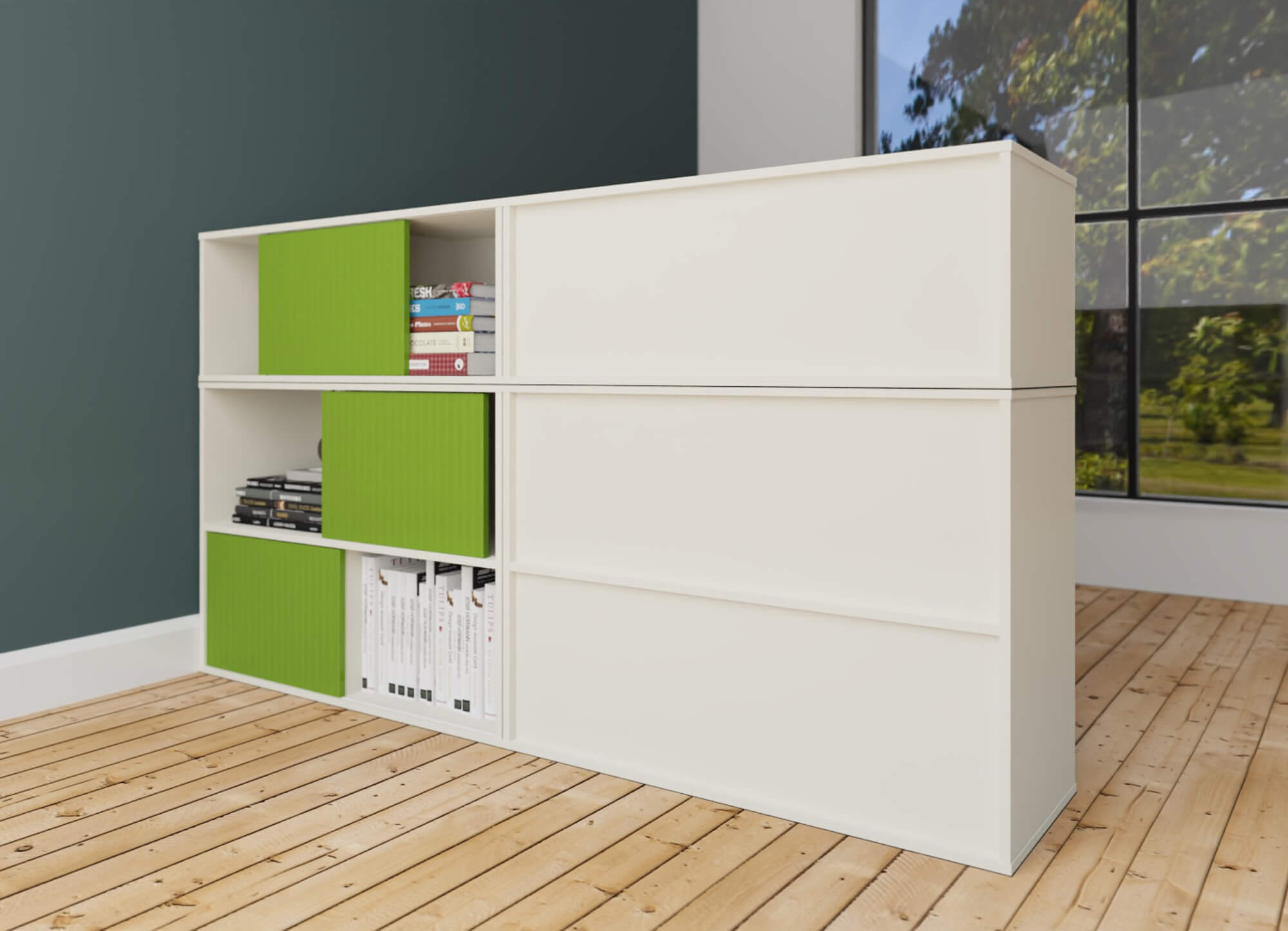 Bei den Türfarben können Sie zwischen drei Dekoren wählen: weiß, grün oder dunkelgrau. Die Schiebetüren sind als Wendetür gestaltet; entweder weiß und grün bzw. dunkelgrau.